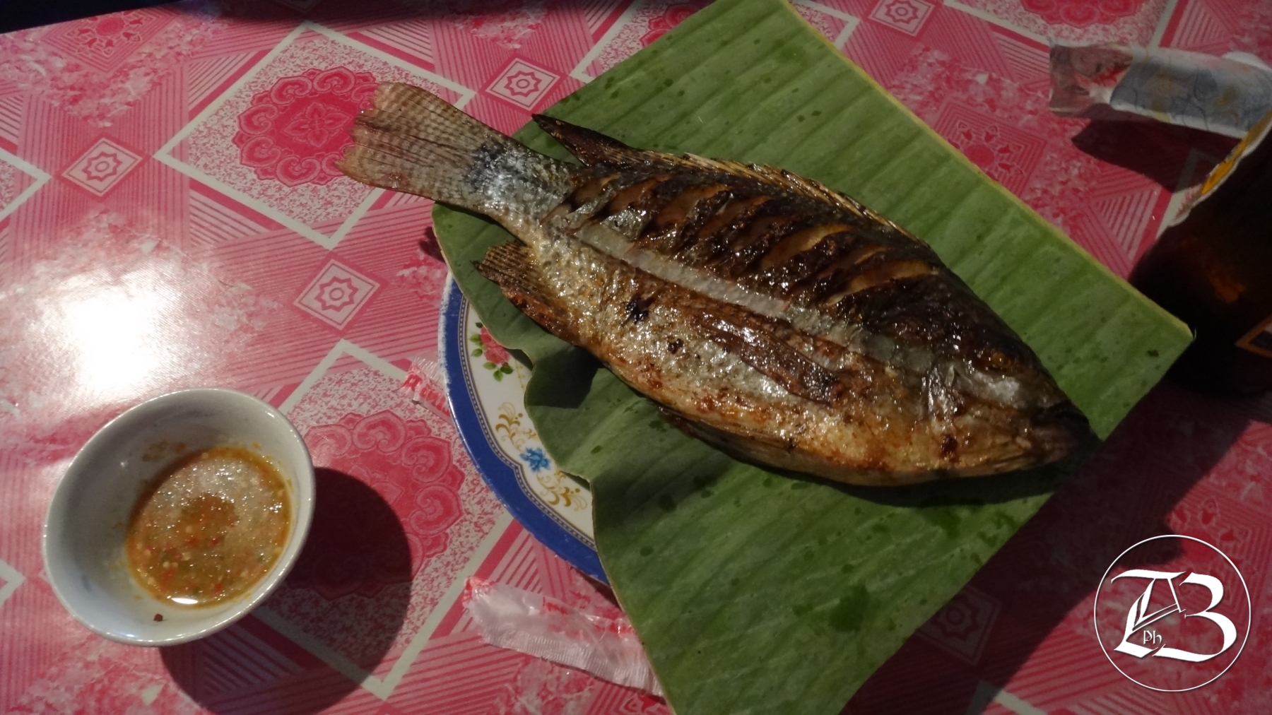 Auch der Rückweg über die Bambusbrücke verlief ohne Zwischenfälle, und so schlenderten wir bald darauf wieder durch die Stadt in Richtung Nachtmarkt. Für eben diesen Markt wird in Luang Prabang allabendlich die Hauptstrasse vor dem Königspalast gesperrt, wo anschliessend von Hand gefertigte Textilien, Souvenirs und Lebensmittel angeboten werden. Wie bereits am Vortag, wollten wir uns dort verpflegen. Heute entschieden wir uns für einen gegrillten, grossen Mekong-Fisch. Es ist also noch speziell diesen nur mit Stäbchen zu Essen…