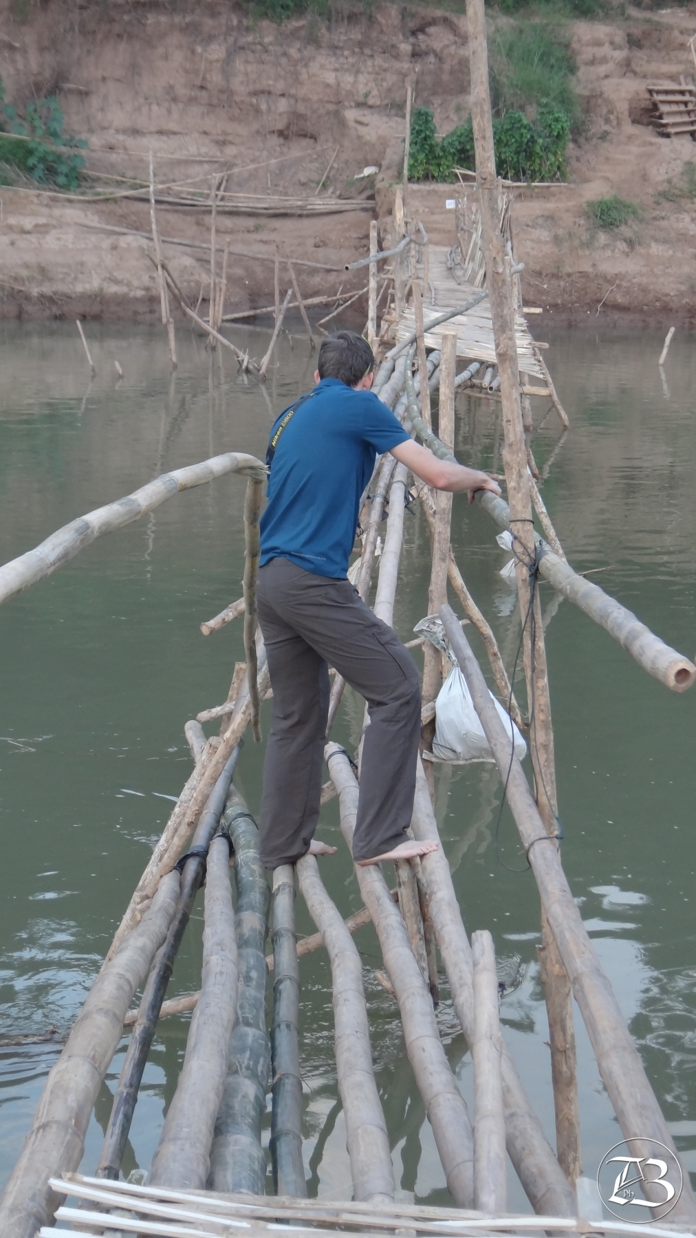 Da die Sonne inzwischen bereits tief am Himmel stand, wollten wir den Sonnenuntergang von östlich der Stadt aus betrachten. Dazu mussten wir aber zuerst über den Nam Khan, einem Nebenfluss der dort in den Mekong mündet. Kurz vor der Flussmündung gibt es eine Bambusbrücke, welche jedes Jahr nach der Regenzeit wieder neu erstellt wird und gegen ein geringes Entgelt benutzt werden kann. Als wir das steile Bachbett hinunter gekraxelt waren und uns langsam der Brücke, oder eher dem Steg, näherten, sahen wir, dass diese in der Mitte etwas lädiert war. Es fehlte über mehrere Meter der Bambus-Belag (dünne, zusammengeflochtene Halme) und auch das Tragwerk in der Form von dicken Bambusrohren war nicht mehr ganz in seiner ursprünglichen Form. Ein paar Touristen aus den unterschiedlichsten Ländern standen ratlos um die Brücke herum, probierten teilweise diese zu überqueren, taxierten diese jedoch alle als nicht passierbar und kehrten wieder um. Meine Lagebeurteilung sage etwas Anderes. So überquerten wir beide trockenen Fusses und mit guter Laune vorsichtig und erfolgreich den Steg. Unser Beispiel machte natürlich Schule, und so waren wir nicht ganz die Einzigen beim Sunset Viewpoint. Leider waren wir eh etwas spät dran und da der Himmel im Bereich des Horizontes etwas mit Wolken verhangen war, wurde nichts aus dem romantischen Sonnenuntergang aus dem Bilderbuch. Nichts desto trotz war dies ein schöner Platz, um das Treiben auf dem Mekong bei Anbruch der Nacht zu beobachten.