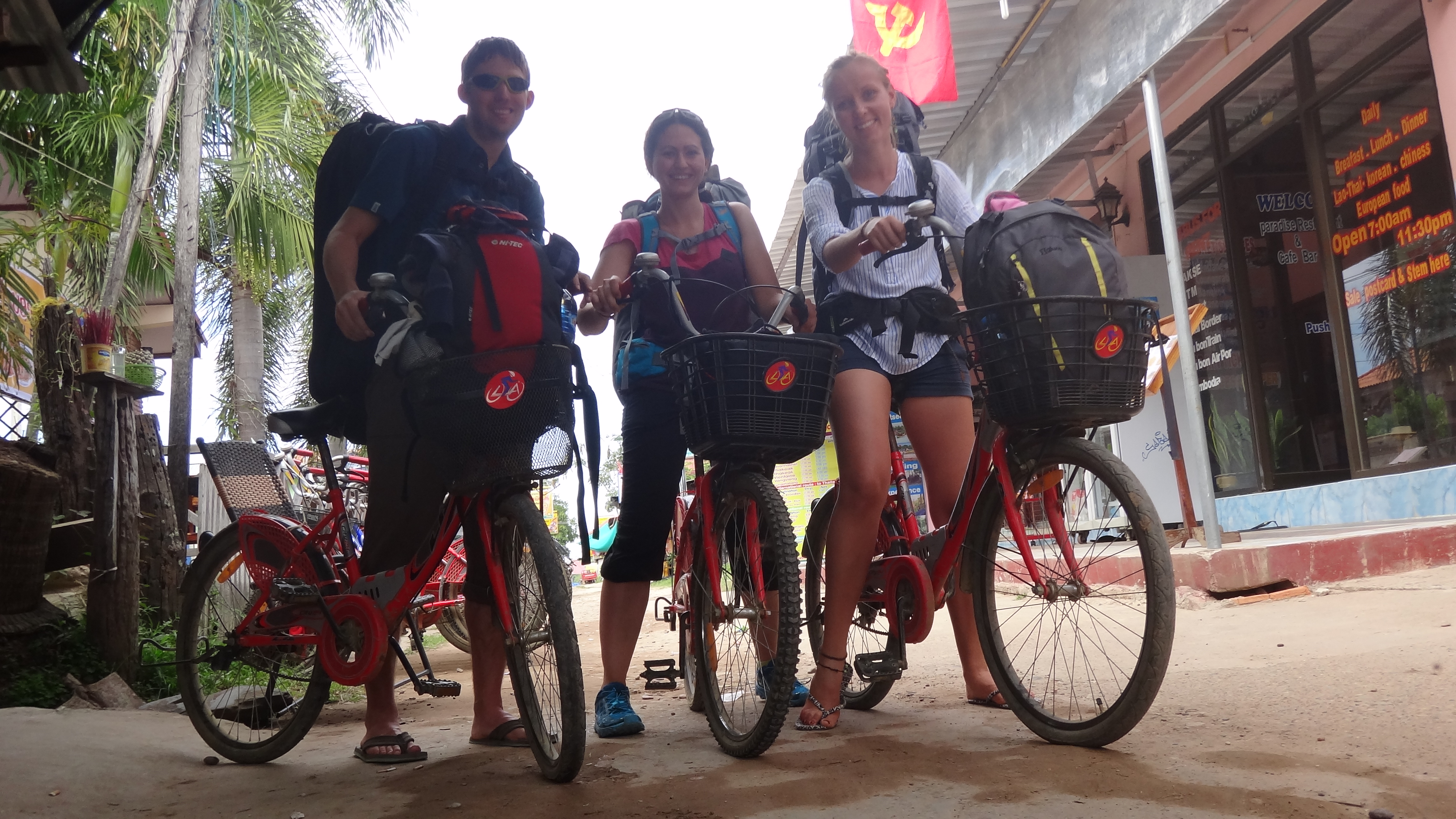Wir hatten unser Ziel erreicht. Gemeinsam mit der Schwedin Diana, welche alleine unterwegs war, schauten wir nun für ein TukTuk, welches uns auf die andere, etwas ruhigere Insel Don Khon bringen sollte. Die TukTuk`s hier waren Motorfahrräder mit einem kleinen Seitenwagen. 2 Passagiere hatten in diesem Seitenwagen Platz und je nachdem fand ein Dritter hinter dem Fahrer auf dem Motorrad Platz. Da von uns aber ein absolut überrissener, nicht verhandelbarer Preis verlangt wurde entschieden wir uns kurzerhand ein Velo (ca. 1.20 Fr. pro Tag) zu mieten und den etwas 4,5km langen Weg so zurück zu legen. Die Insel war sowieso bekannt als Fahrradinsel. Der TukTuk-Fahrer von vorhin lächelte uns zu und meinte das wäre eine gute Idee – auch wenn die Strecke von ihm vorhin als weit und beschwerlich beschrieben wurde. Dies änderte sich aber wohl, als wir den Deal mit ihm nicht eingingen. Beladen mit unserem Gepäck starteten wir unsere Fahrt. Das Handgepäck konnten wir in den Korb vorne beim Lenkrad legen. Die Fahrt führte durch das Dörfchen Don Det und anschliessend quer über die Insel bis wir die Brücke nach Don Khon erreichten. Einige Menschen lächelten uns unterwegs an und schauten uns interessiert zu. Für sie war es wohl witzig den Touristen bei solchen Aktionen zuzuschauen. Die Fahrt war anstrengend und die Strasse war ein unbefestigter Weg mit Wellen und Löchern, aber wir kamen gut voran. Es war heiss und sowohl Diana als auch ich hatte etwas mit einer Erkältung zu kämpfen und fühlten uns nicht ganz gesund. Wir waren froh als wir unser Ziel erreichten. Wir spürten nun auch unsere Schultern und den Rücken, wegen den voll beladenen Rucksäcken.