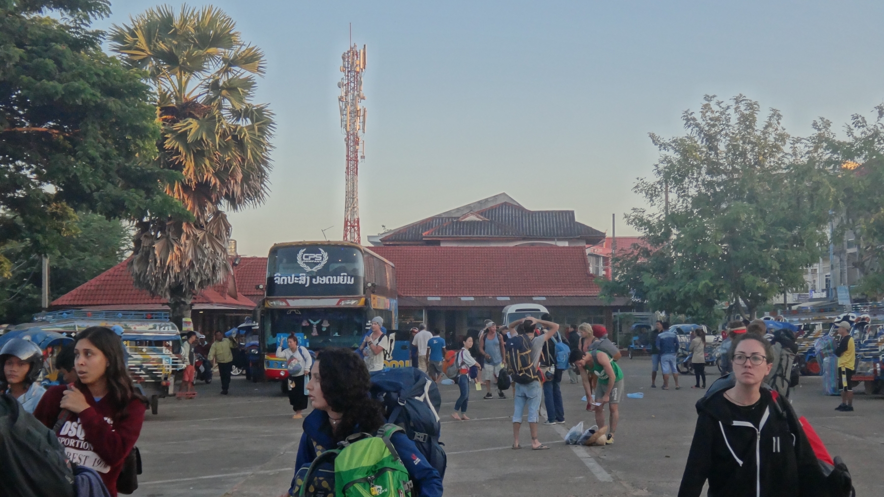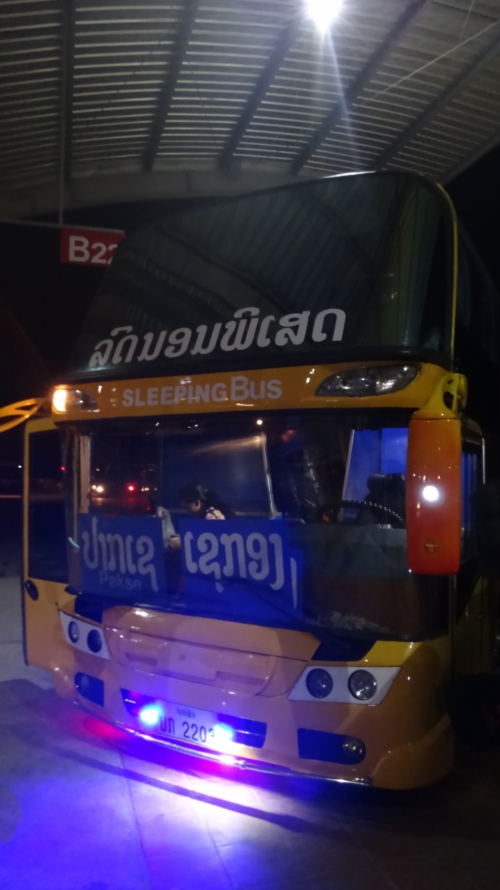 Im Hotel bereiteten wir uns für die Reise mit dem Sleepingbus vor. Wir konnten uns noch etwas erfrischen und bequemere Kleidung für die Nacht anziehen. Um 18.00Uhr sollte uns ein Bus beim Hotel abholen. Nach einer halben Stunde des Wartens baten wir den etwas speziellen Ali (Besitzer des Hotels Ali) ob er für uns beim Vermittler anrufen kann. Leider war nur ein Tonband in der laotische Sprache zu hören. Da weder Ali noch wir deren mächtig sind, blieb uns nichts Anderes als weiter zu warteten. Nach fast einer Stunde klappte es doch noch und wir stiegen in den schon recht vollen Minibus. Den bequemsten Platz den ich fand war auf Andrés Beinen :-). Trotzdem luden wir noch mehr Leute auf, bis wir dann wirklich voll beladen zum Bussbahnhof fuhren. Dort angekommen hatte unser Chauffeur Mühe den richtigen Sleeping-Bus zu finden. Ausserdem wurde uns, und auch den anderen Mitreisenden, die Quittungen mit der Zahlbestätigung abgenommen. Was ja eigentlich hier ganz normal ist, da die Tickets immer wieder umgetauscht werden müssen. Dieses Mal bekamen wir aber nur einen Fresszettel mit unseren Platznummern. Leider konnte der Fahrer auch kaum ein Wort Englisch. Am Busbahnhof angekommen, folgte André dem umherirrenden Fahrer. So kamen wir nach ein paar Runden durch den Busbahnhof an einen Schalter, wo der Fresszettel gegen ein Ticket nach Pakse eingetauscht werden konnte. Ein Ticket für die Weiterfahrt ab Pakse hatte aber niemand erhalten.
