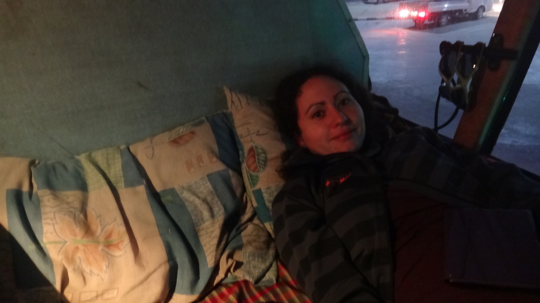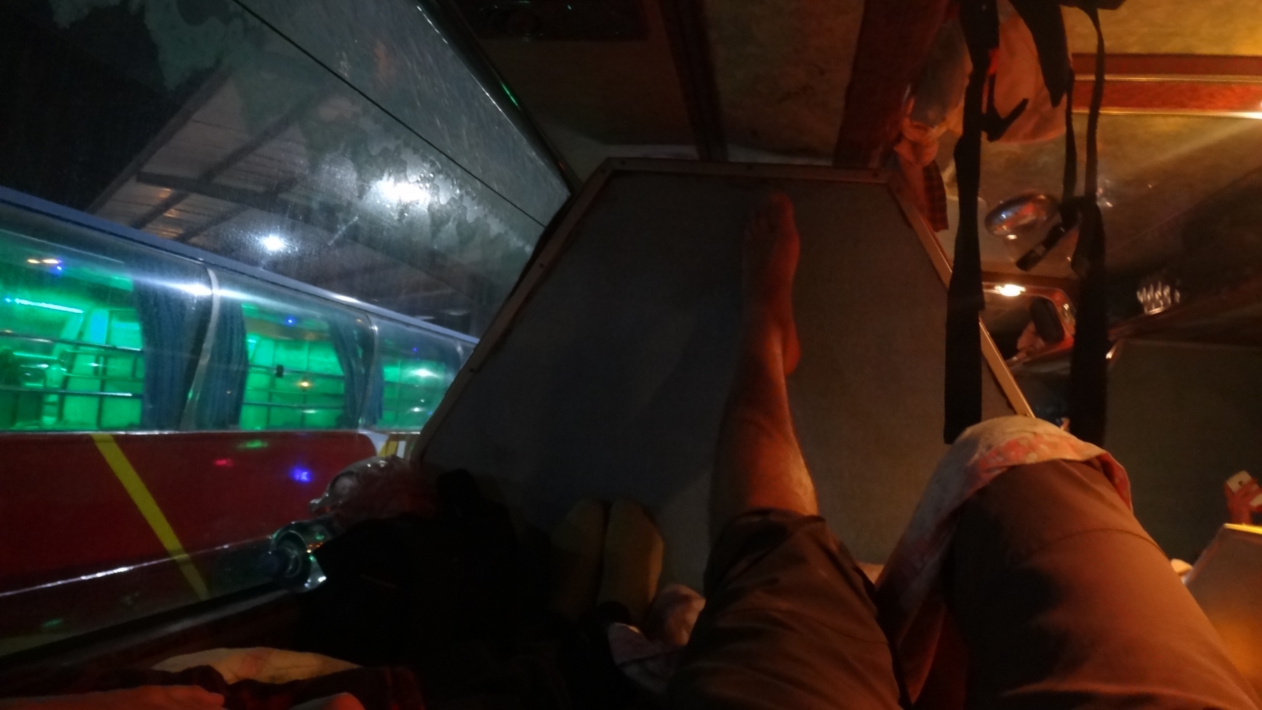 Im 2-stöckigen, vorne farbig blinkenden, sehr alten und teileweise demolierten (die Frontscheibe war an einigen Stellen bereits mit Klebeband wieder geflickt worden) Sleeping-Bus, hatten wir eine Zweierkabine. Einzelplätze gab es nicht. Solche die Alleine reisten, teilten nun den doch sehr engen Platz mit einem fremden Menschen. Für uns war das zum Glück kein Problem. Das Abteil war gerade so lang, dass ich mich strecken konnte. Für André war es definitiv zu kurz. Trotzdem richteten wir uns gemütlich ein. Kissen und Decken waren vorhanden. Die Schuhe mussten wir beim Einsteigen natürlich ausziehen, dazu werden immer Plastiksäcke verteilt. Eine Toilette war auch vorhanden, jedoch war der Boden und auch das WC nass vom Wasser das aus dem Kessel schwabte, der zum Spülen gedacht war und es roch übel. Händewaschen konnte man nach dem WC-Gang, wie an den meisten Orten ebenfalls nicht. Der Gang im oberen Stock war schmal und tief. Das Fenster unserer Schlafkabine reichte dafür fast bis an den Boden, so dass ich im Liegen aus den Fenster schauen konnte. Gemütlich assen wir noch unsere feinen Sandwiches. Die Fahrt startet dann ca. um 20:30 Uhr, nachdem uns gesagt wurde der Bus fährt in 5min und wir dann weitere 45min gewartet hatten. Bereits einige Minuten nachdem wir losgefahren sind, wurde das Licht ausgeschalten. So richteten wir uns ein und schlossen die Augen. Nach mehrmaligen Zurechtrücken und Einrichten konnten wir dann doch einschlafen. Mit wenigen Unterbrüchen schliefen wir doch recht gut. Auch an das Holpern und Schaukeln hatten wir uns schnell gewöhnt. In der Nacht erwachte ich und auch André einmal kurz, weil einer der einheimischen Begleiter des Busses mit einer kleinen Handlampe in unsere Richtung (Wir hatten unsere Kabine im hinteren Teil des Busses) gekommen war. Nachdem er mich wach gesehen hatte, sah er mich an und ging wieder. Am Morgen erfuhren wir dann auf der Weiterreise, dass einem anderen Mitreisenden scheinbar Geld gestohlen wurde. Zum Glück hatte wir beide wie immer unsere Wertsachen ganz nach bei uns platziert und erwachten auch wenn jemand kam.