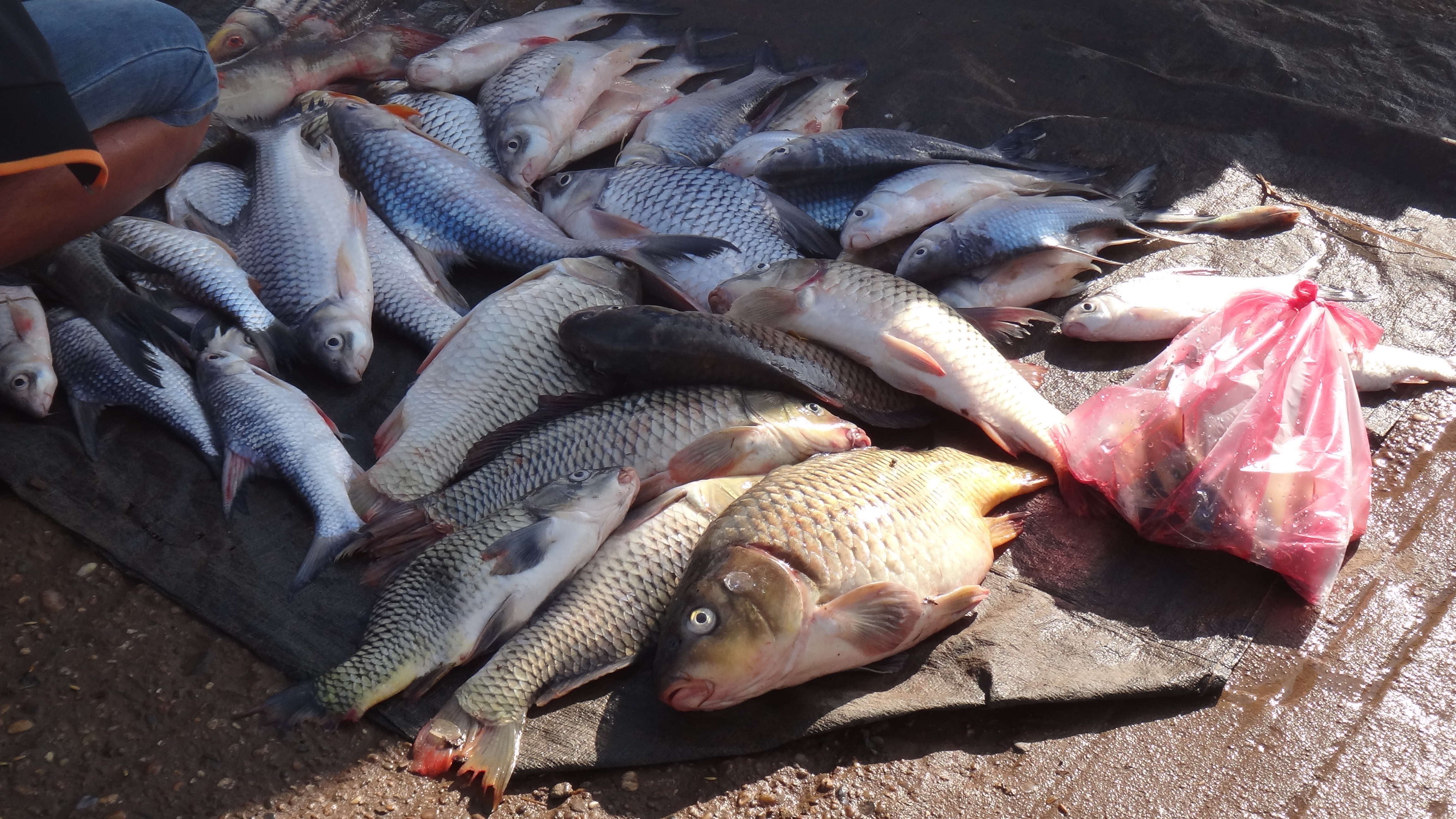 Zuerst mussten wir aber erst einmal in Richtung Grenze kommen. Die Fahrt bis Siem Reap hatten wir in unserem Guesthouse gebucht, so war auch der Boots-Transfer von Don Khon nach Nakasang dabei. Der unfreundliche, griesgrämige Hotelbesitzer (oder der Sohn der Besitzerin) war auch pünktlich mit seinem kleinen Schiff bereit. Leider reichte es nicht mehr, bei der herzlichen Frau von unserem Lieblings-Streetfood einen Shake zu holen, da sie gerade kein Eis mehr hatte. In Nakasang angekommen, verliessen wir das kleine Schiff und machten uns, nach ein paar Fotos vom fangfrischem Fisch, auf Richtung Busstation. Der Hotelbesitzer lief auch in die gleiche Richtung, spazierte dann zur Tankstelle, kam wieder in unsere Richtung und deute anschliessend auf ein Reiseunternehmen. Also folgten wir ihm. Schlussendlich war es so, dass wir mit unserem Billett wiedermal nirgends hingekommen wären. Das Ticket mussten wir dort gegen ein neues umtauschen, welches der Hotelbesitzer erst hier bezahlte. Natürlich war wieder einmal warten angesagt. Kyra freundete sich natürlich wieder mit einem Tier an. Dieses Mal war es ein herziger Strassenhund, welcher wohl Flöhe hatte – es hat in auf jeden Fall ständig gebissen.